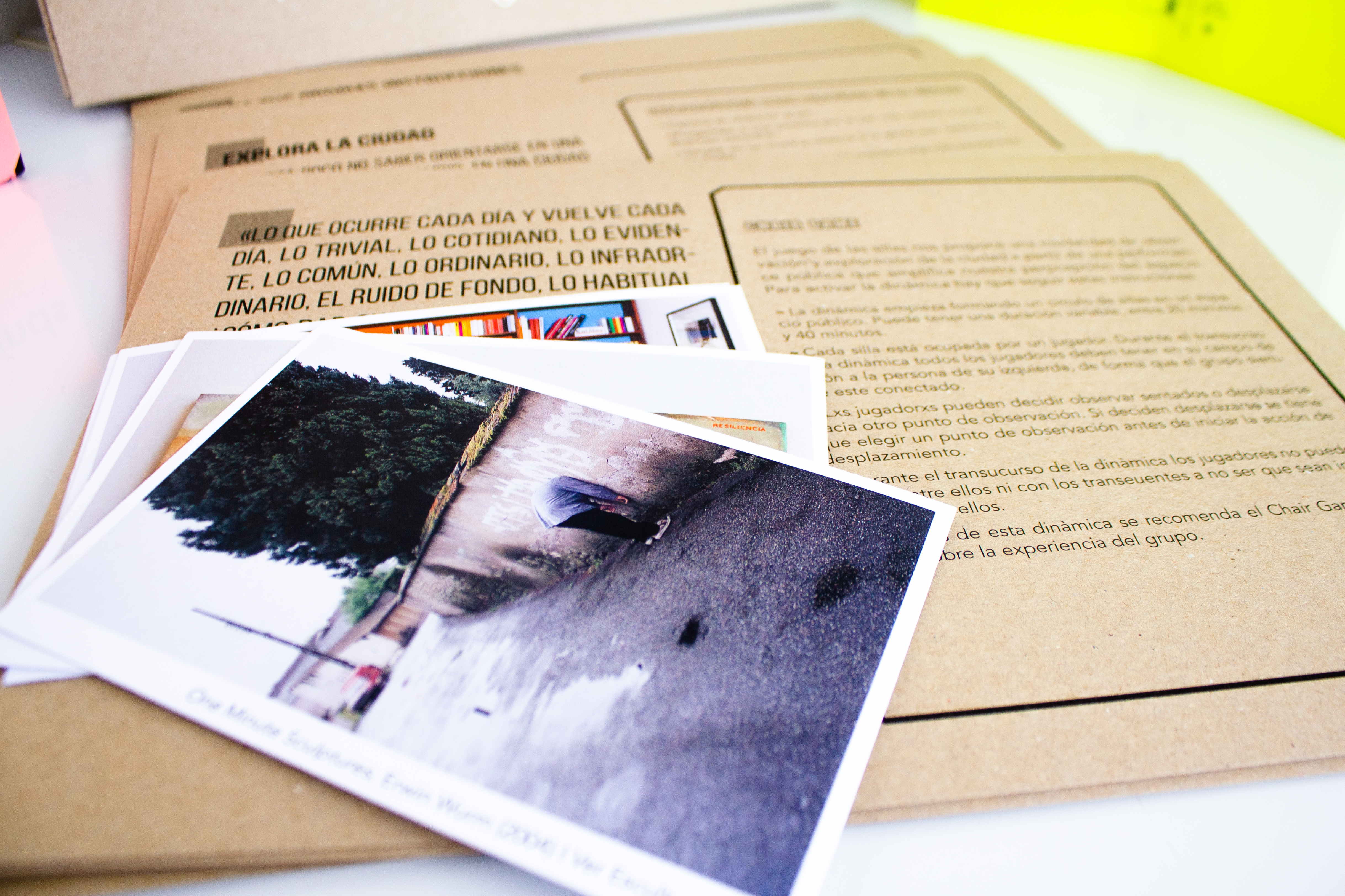 El proyecto se concreta en una publicación-manual que contiene scores, partituras, contenidos y metodologías de trabajo para activar procesos situados de exploración de la ciudad a partir de estrategias basadas en el arte de acción, la performance, la literatura, el happening o el arte público.